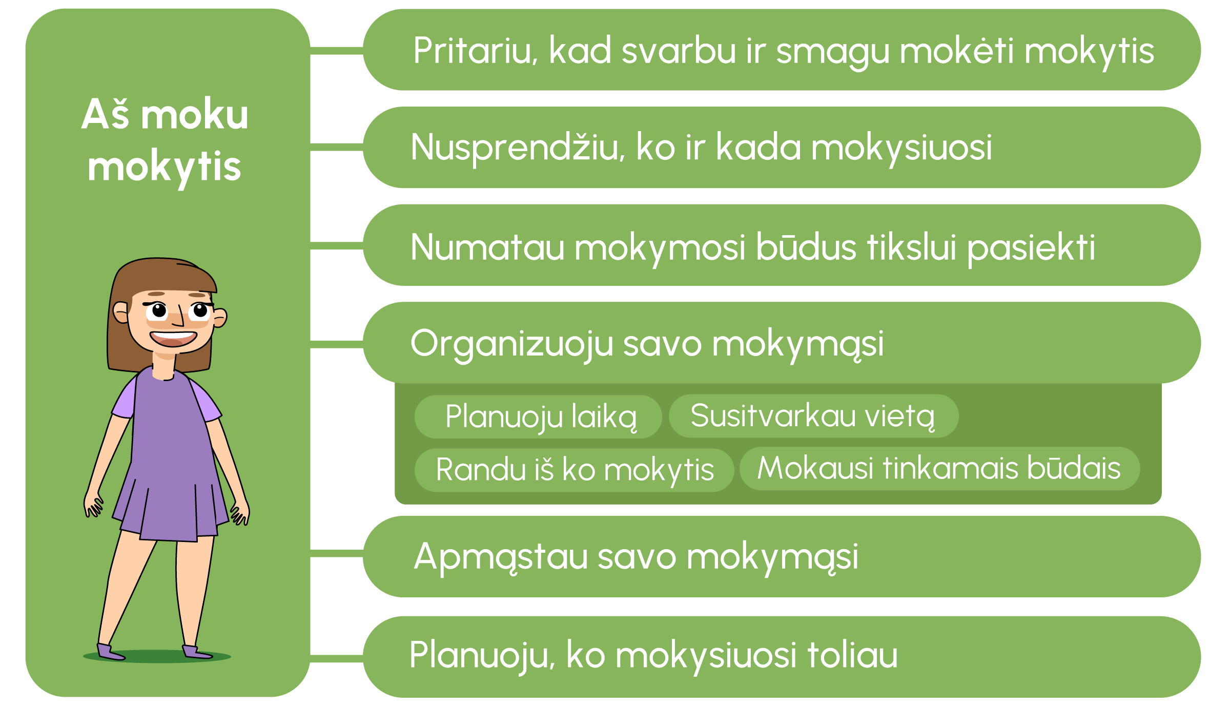 Svarbu sau pasakyti: aš tikrai galiu išmokti mokytis. Įsivertinti savo mokėjimą mokytis tau padės ši schema. Jei joje užrašyti teiginiai tau tinka, puiku, tu moki mokytis. Jei kai kurie teiginiai netinka, visada gali patobulinti šią savo kompetenciją.