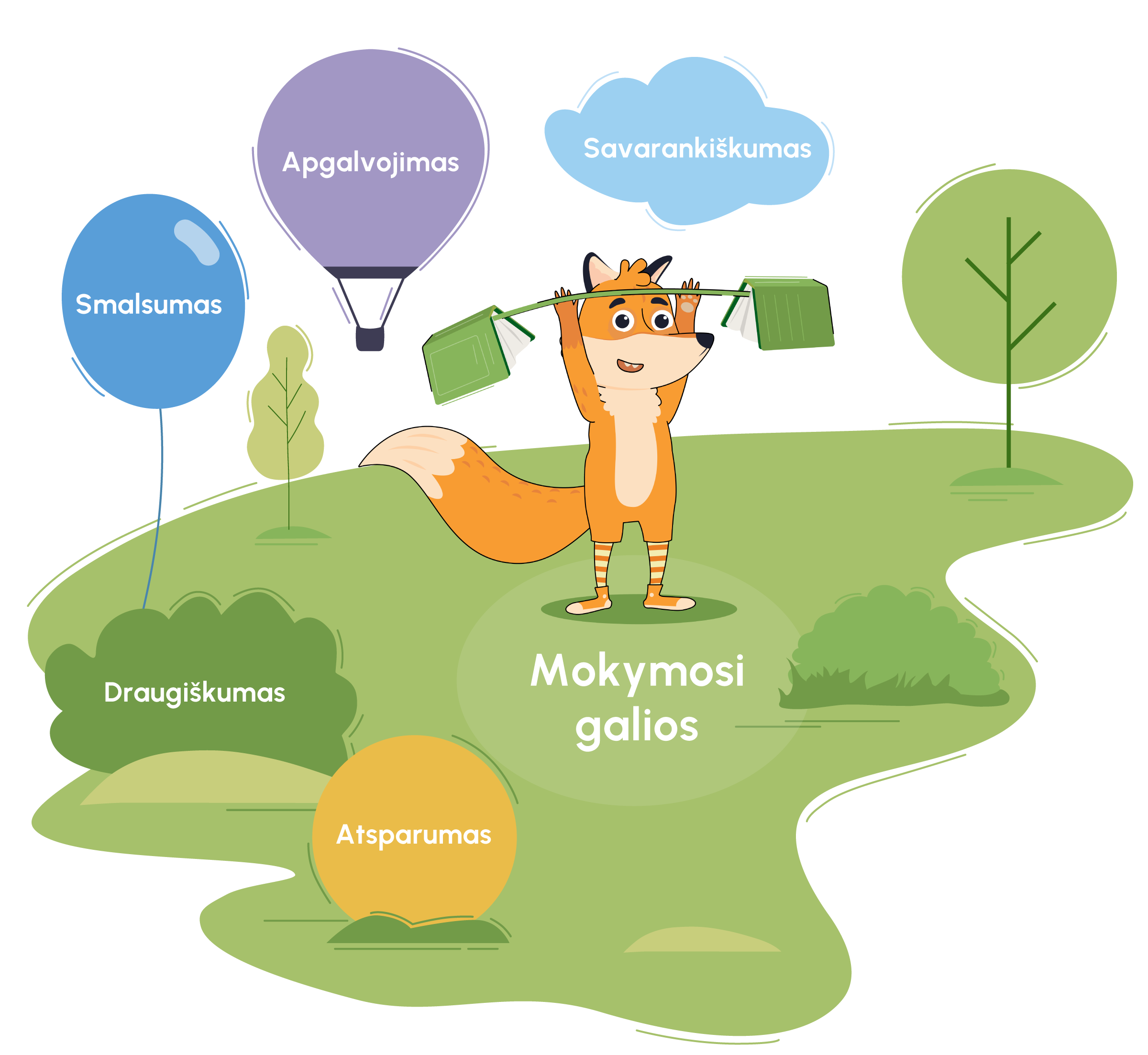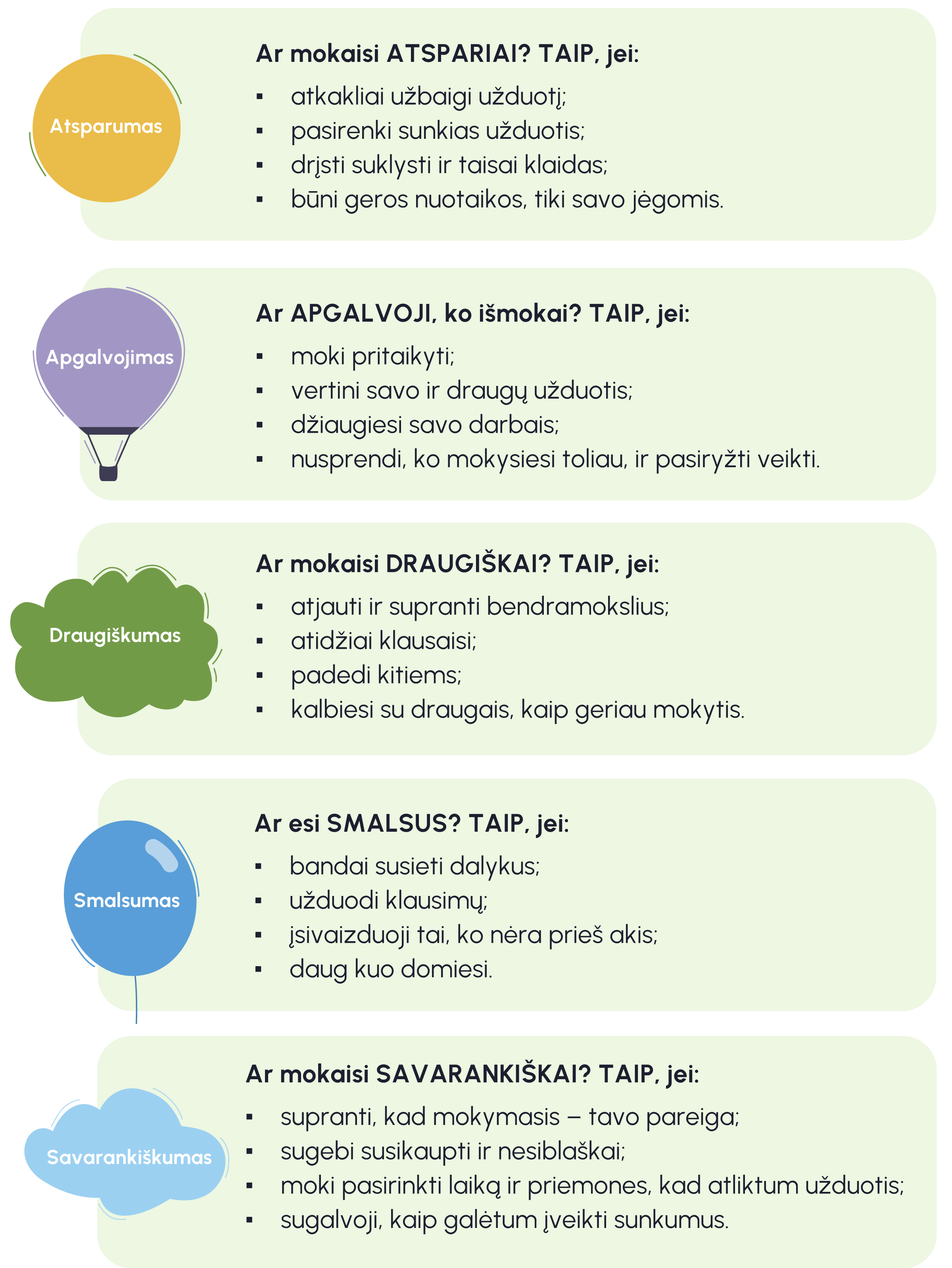 Yra 5 mokymosi galios: atsparumas, apgalvojimas, draugiškumas, smalsumas, savarankiškumas.