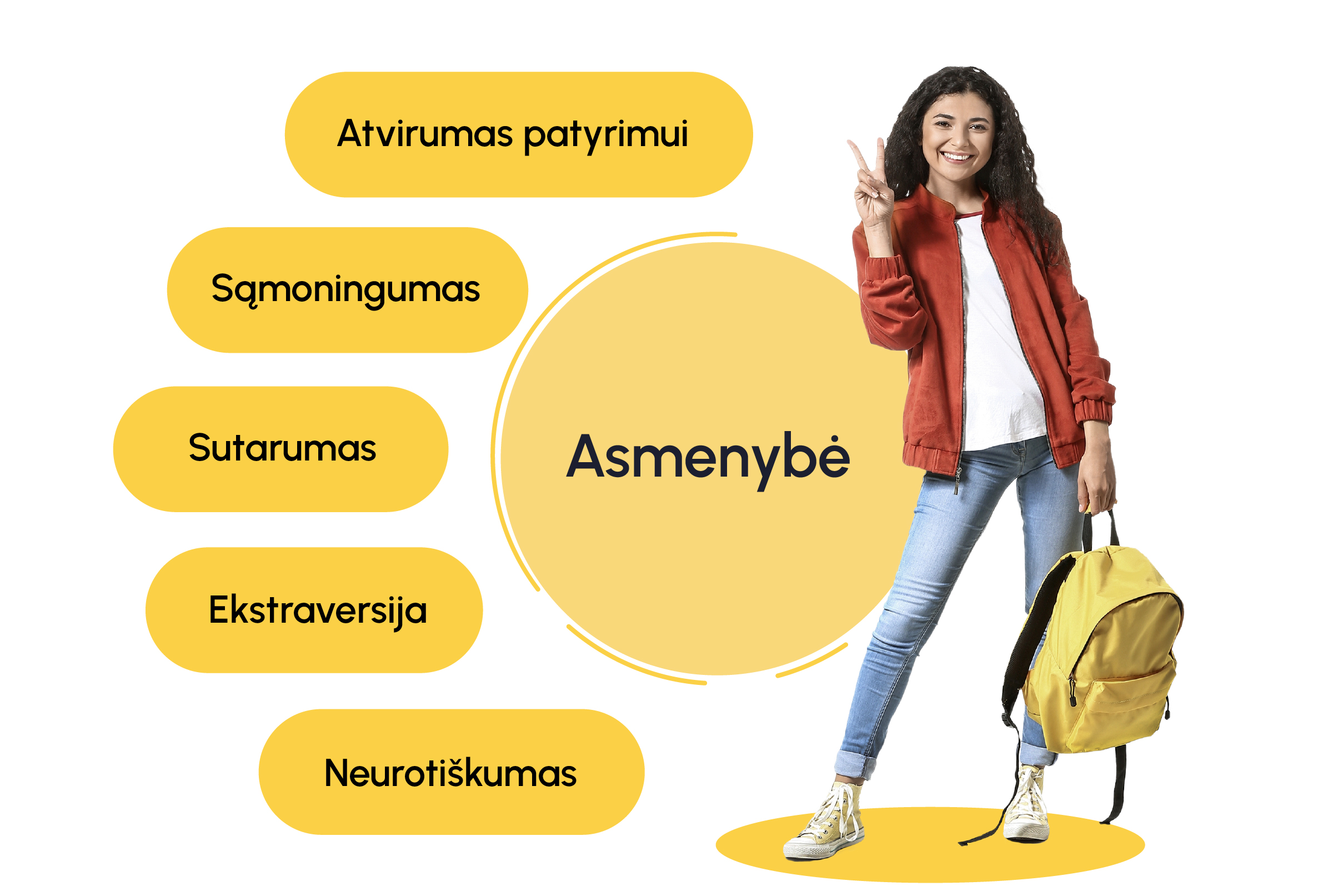 Išskiriami penki asmenybės bruožai, lemiantys jos elgesio tipą ir reakcijų į aplinką pobūdį: atvirumas patyrimui, sąmoningumas, ekstraversija, sutarumas, neurotiškumas (žr. 1 pav.).