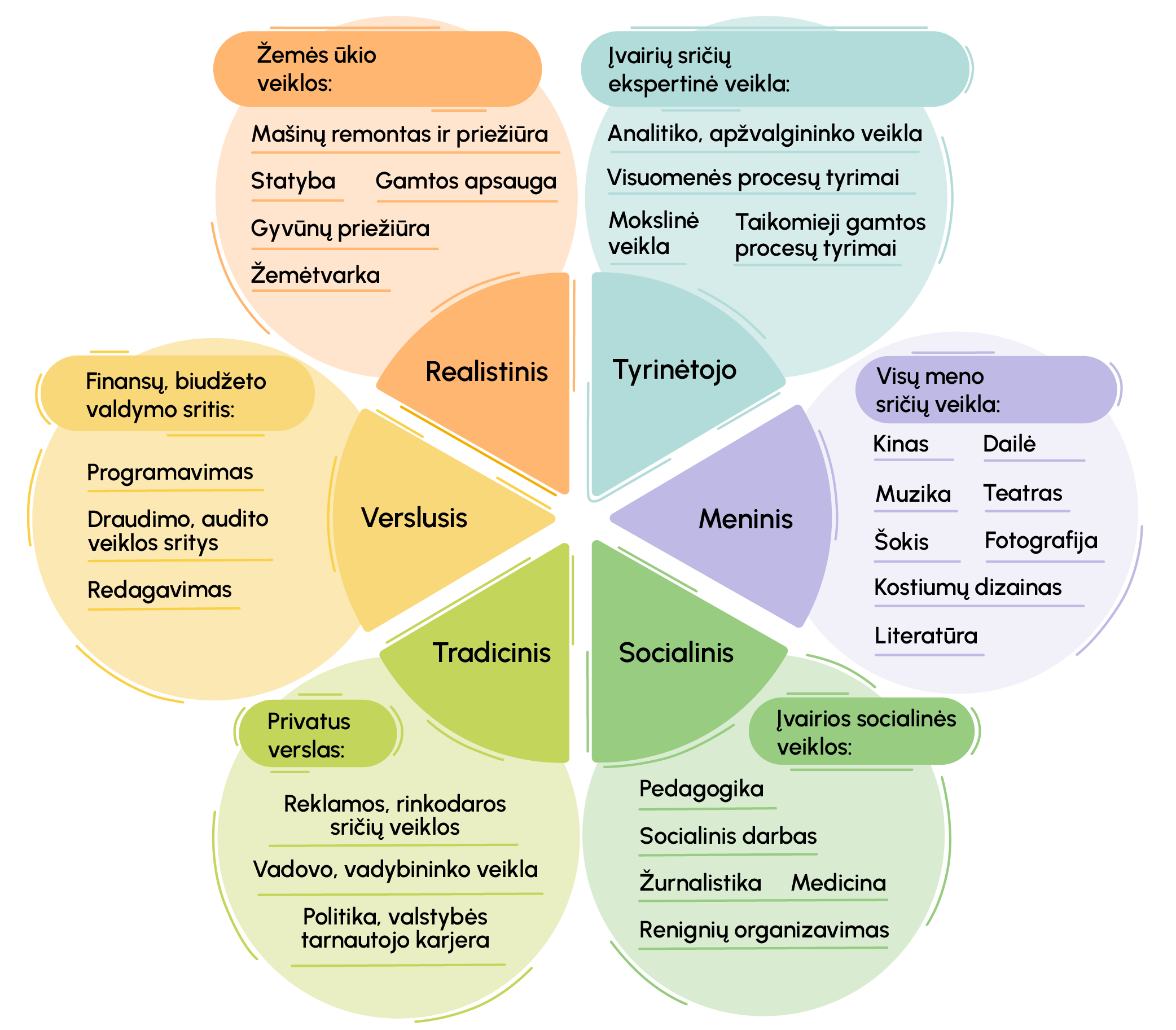 1. dauguma žmonių gali būti priskirti vienam iš šešių tipų: realistinis, tyrinėtojo, meninis, socialinis, verslusis ir tradicinis;