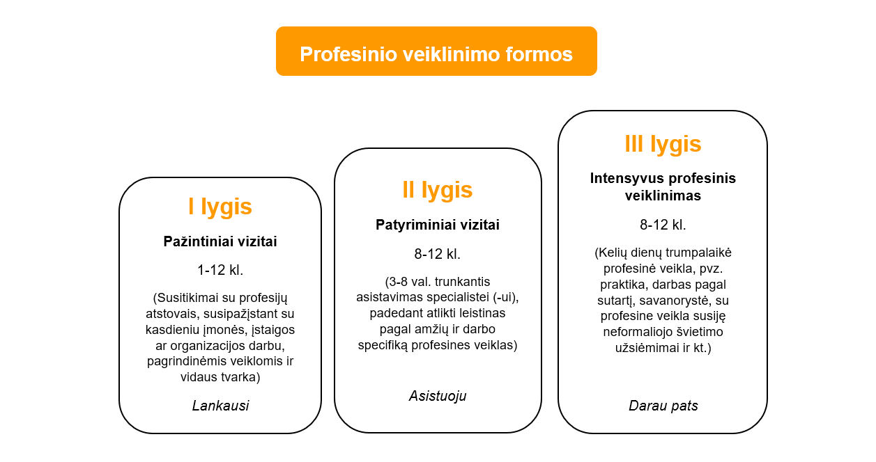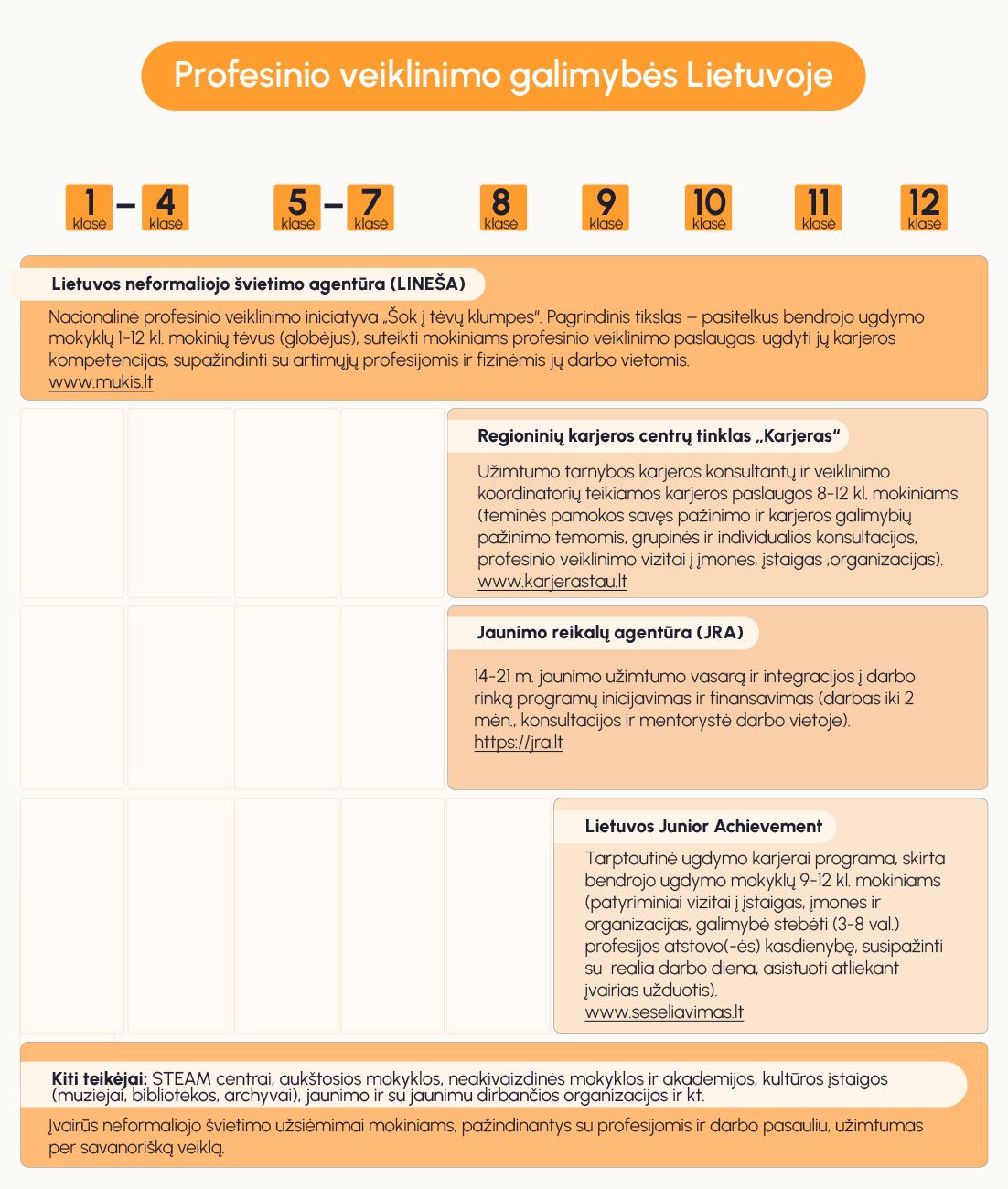 Daugelyje savivaldybių įgyvendinama Jaunimo reikalų agentūros (JRA) remiama 14-19 m. jaunimo užimtumo vasarą ir integracijos į darbo rinką programa, kurios pagrindinis tikslas – sudaryti sąlygas jaunimo užimtumui vasaros laikotarpiu, didinti galimybes jauniems žmonėms įgyti praktinių įgūdžių, specialiomis subsidijomis skatinti darbdavius įdarbinti jaunus žmones. Prie profesinio veiklinimo galimybių plėtojimo šalyje prisideda ir kiti teikėjai. Pavyzdžiui, nevyriausybinė organizacija „Lietuvos Junior Achievement“ ketvirtus metus iš eilės sėkmingai įgyvendina 9-12 kl. mokiniams skirtą pasaulinę ugdymo karjerai programą LJA „Šešėliavimas”. Edukacines paslaugas, padedančias pažinti įvairias profesijas, mokiniams taip pat siūlo STEAM centrai, aukštosios mokyklos, neakivaizdinės mokyklos ir akademijos, kultūros įstaigos, jaunimo ir su jaunimu dirbančios ir kt. organizacijos.