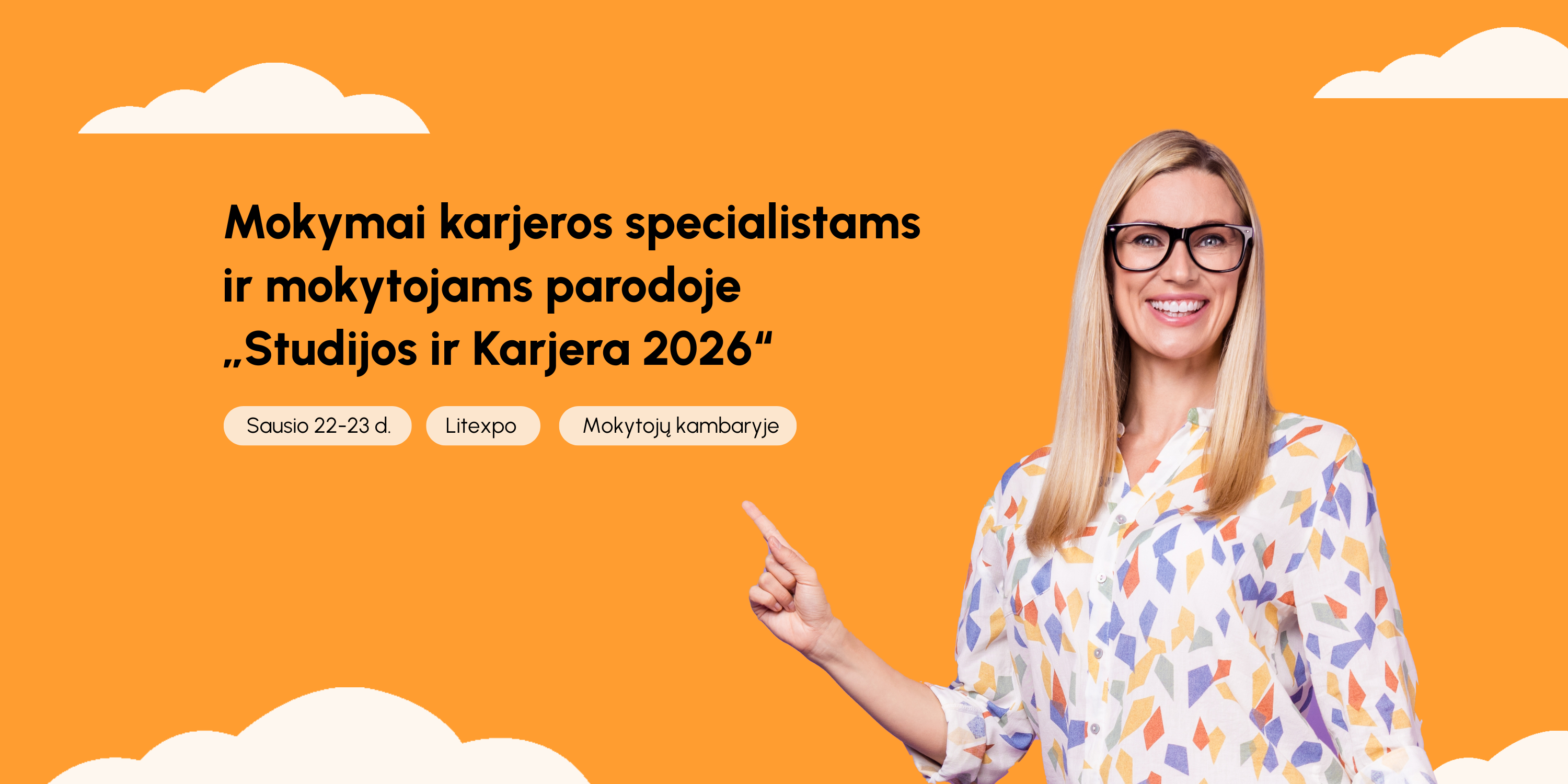 Sausio 22-23 d. Lietuvos parodų ir kongresų centre LITEXPO (Laisvės pr. 5, Vilnius) vyks kasmetinė karjeros planavimo paroda „Studijos & Karjera Lietuvoje 2026”. Joje MUKIS komanda visus renginio dalyvius konsultuos apie MUKIS platformos galimybes ir kvies pasiklausyti aktualaus LINEŠA pranešimo apie dirbtinio intelekto taikymą karjeros konsultavime, o karjeros specialistus ir mokytojus - aktyviai dalyvauti praktiniuose užsiėmimuose mokytojų kambaryje.