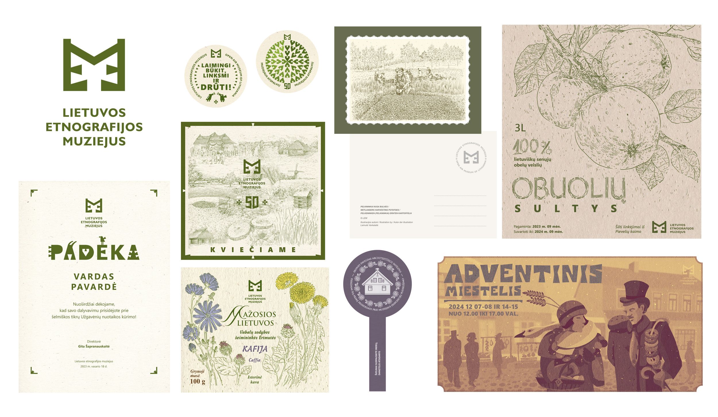 Lietuvos etnografijos muziejaus vizualinis identitetas: logotipas, padėka, Mažosios Lietuvos atvirlaiškis, lipdukai, muziejaus 50-ečio kvietimas, sulčių ir arbatų pakuotės dizainas, Adventinio miestelio vizualinis sprendimas (2023-2024 m.)