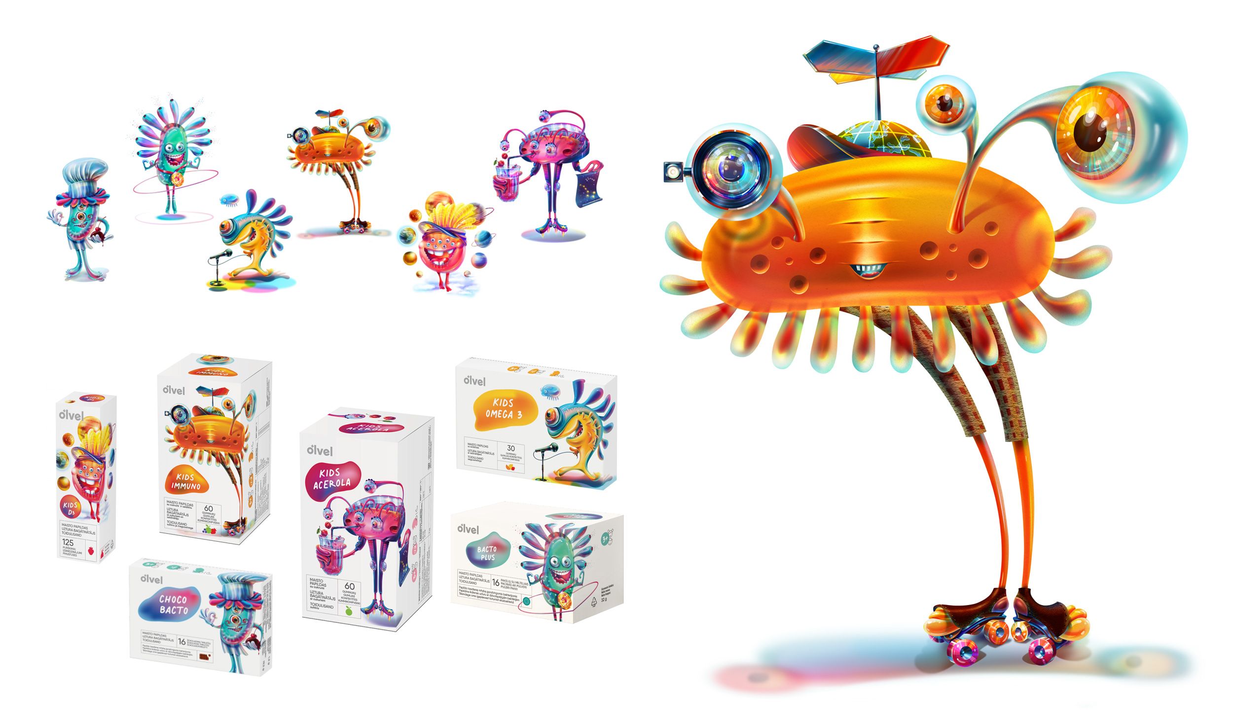 OLVEL papildai vaikams. Pakuočių iliustracijos. Dizaino studija Clinic 2012, užsakovas OLVEL (2020-2021 m.)